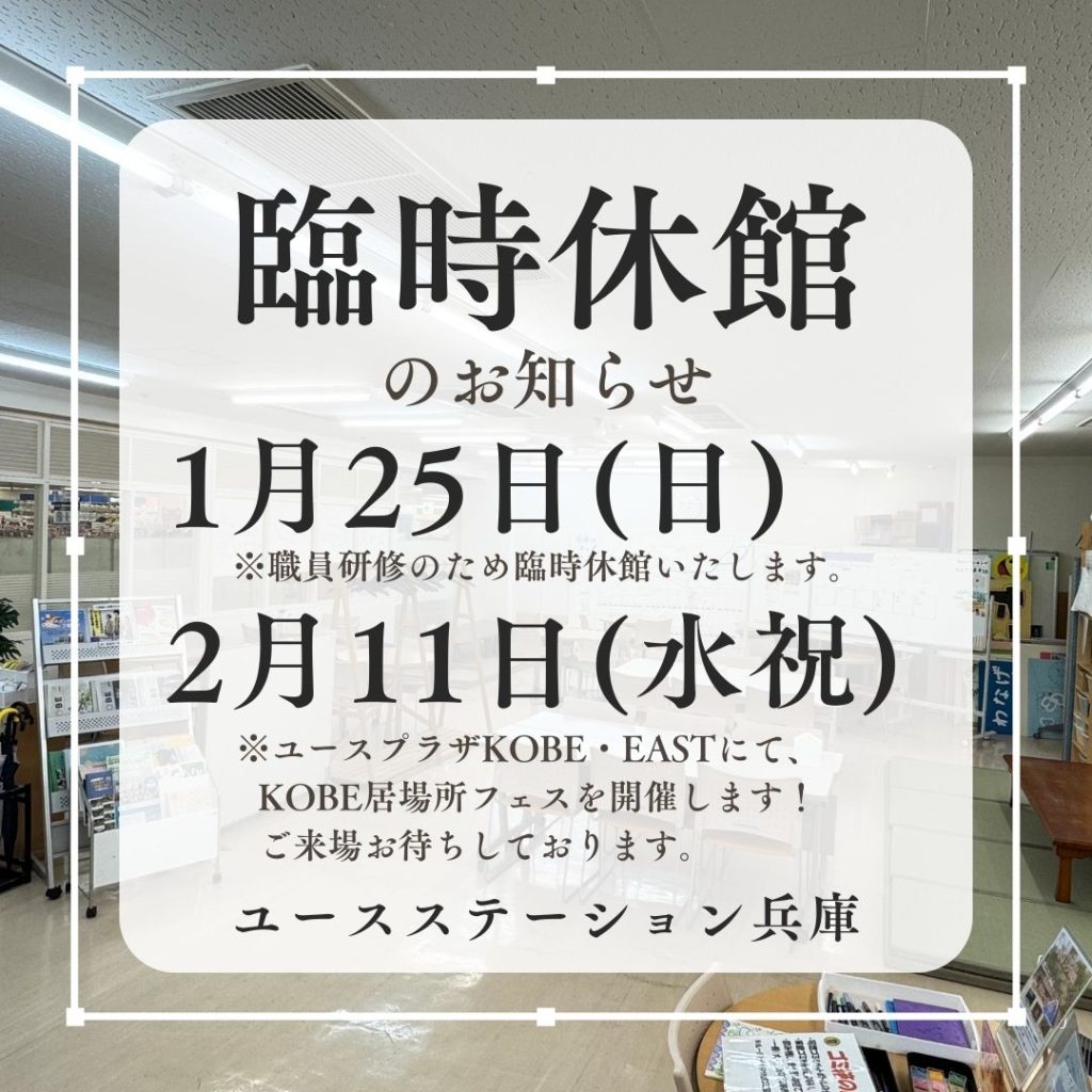 臨時休館のお知らせ 2026年1月22日 最終更新日時 : 2026年1月22日 kanriysh ユースステーション兵庫は、 1月25日(日)は職員研修の為臨時休館いたします!! また、 2月11日(水・祝)は、ユースプラザKOBE・EASTにて「KOBE中高生居場所フェス」開催のため、 臨時休館とさせていただきます。 受験生にとって大事な時期にお休みになってしまいごめんなさい・・・ 2月11日は息抜き程度にKOBE居場所フェスに来てください!! FacebookXBluesky